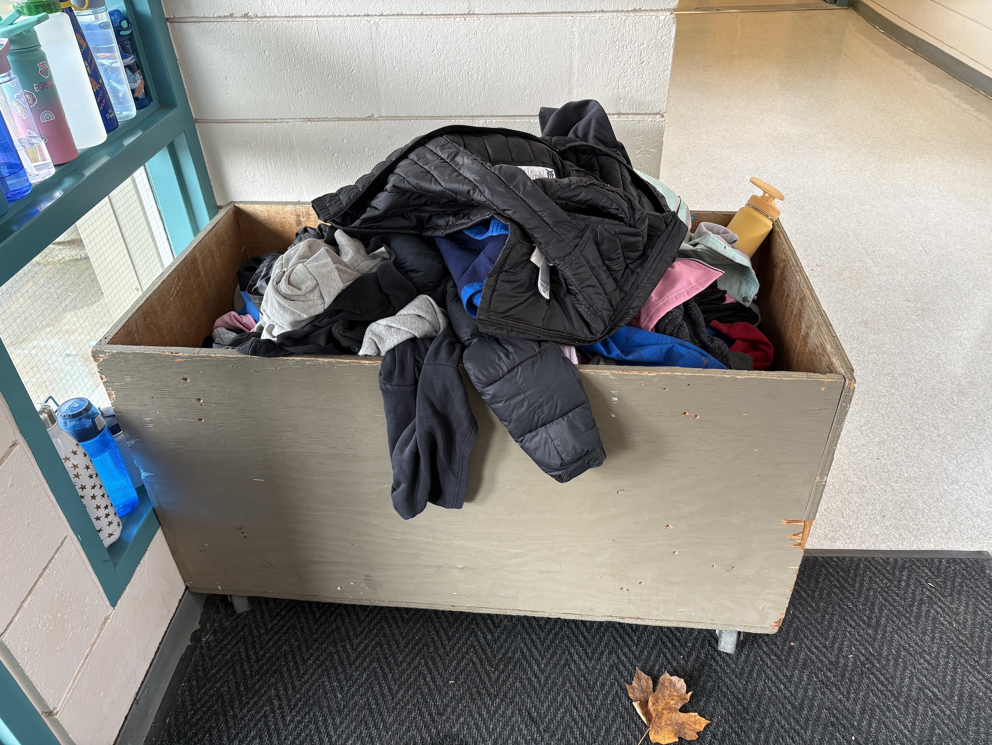 Our bin is nearly full! Weather permitting, it will be placed outside at the front of the school. Please check for missing items.
