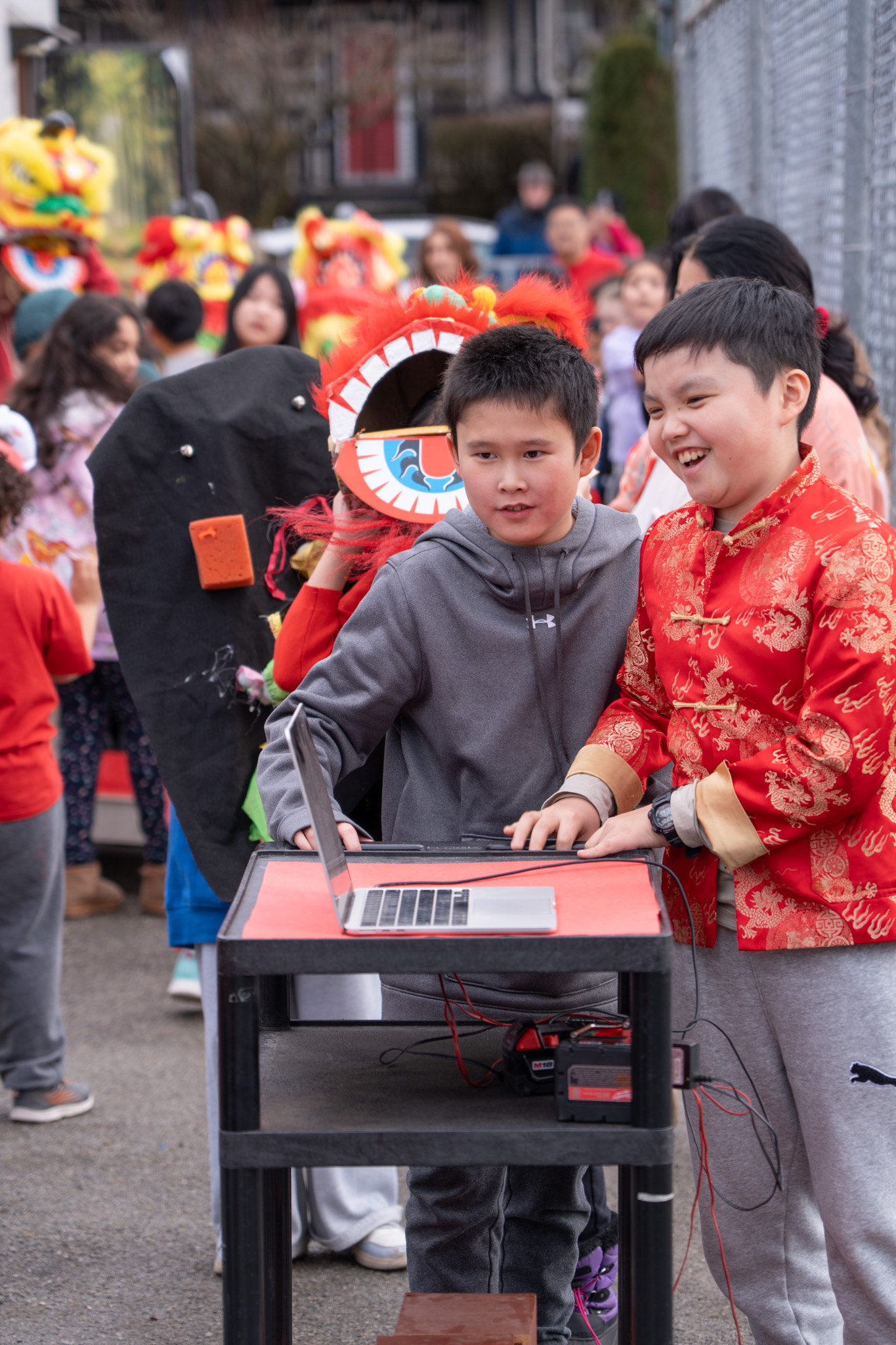 Students in grades 4 to 7 took on a range of roles during the event. Some danced as the lion’s head or body, others played drums, collected red envelopes, or helped carry music through the halls using a laptop and speaker on a cart. Kindergarten and Grade 1 students also joined the parade, shaking noisemakers as they followed along.