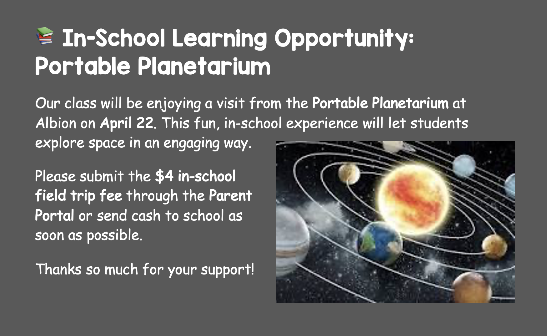 The next PAC meeting is on Monday, April 20 at 7:00 pm