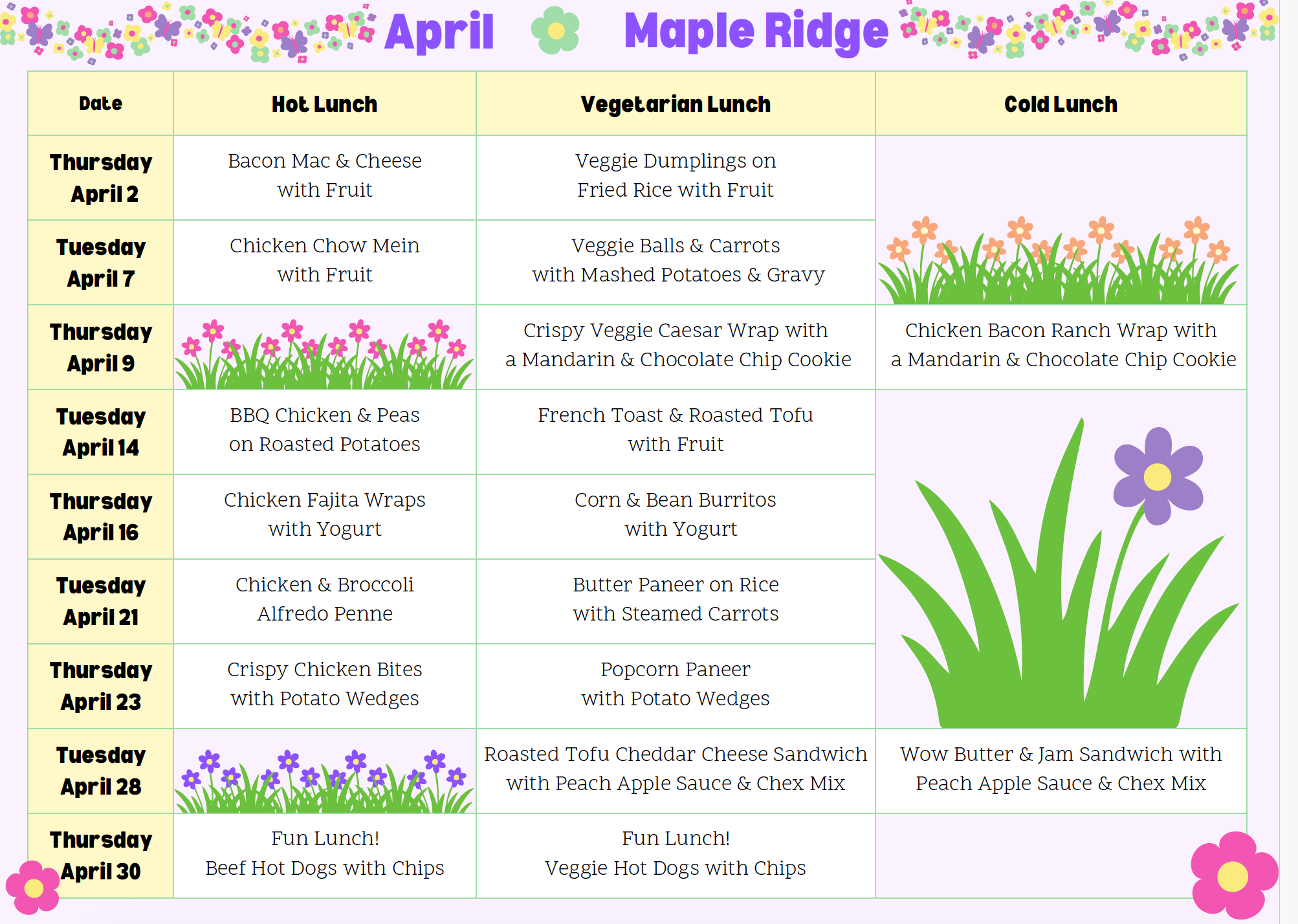 April Simple Foods Tuesday/ Thursday Universal Lunch Menu