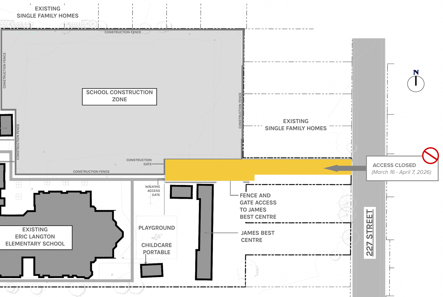 Beginning March 16, 2026, access from 227th Street to the school site will be temporarily closed for approximately three weeks, with reopening anticipated by April 7, 2026. (Temporary access closure in yellow on the map below.)
