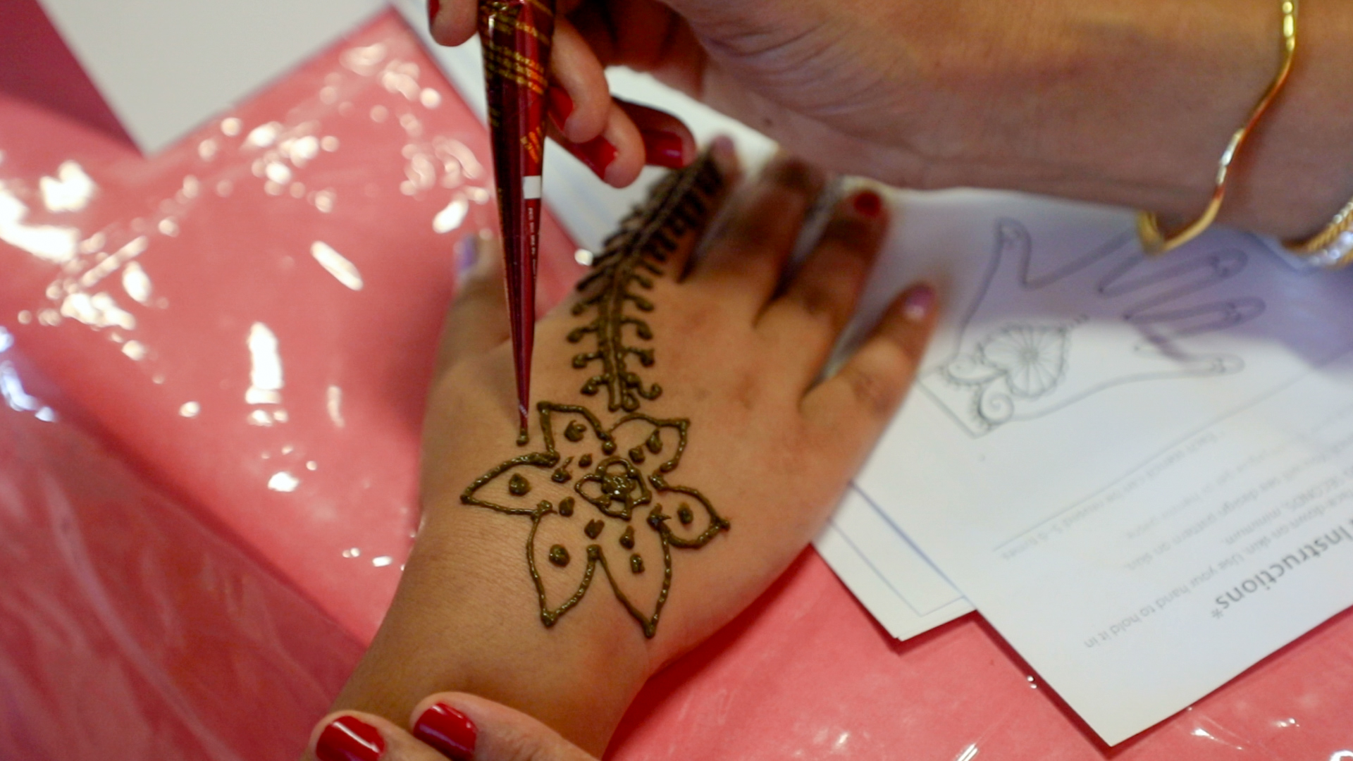 After the assembly, the school set up mehndi tables in the foyer with help from teacher and parent volunteers. Students were able to each get one hand adorned with different patterns and designs using henna.