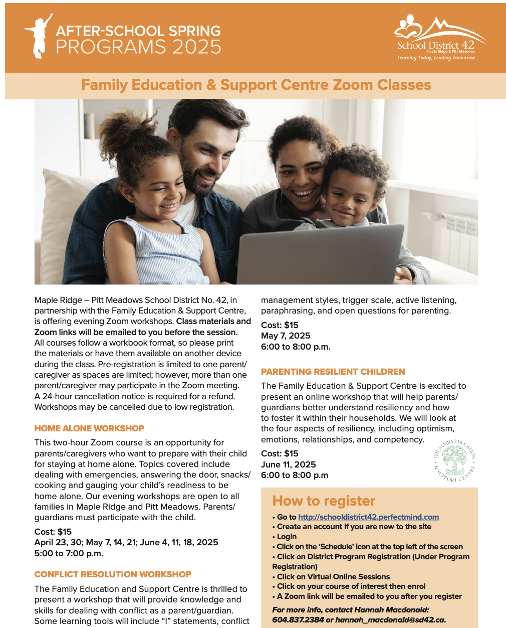 The Foundry provides mental health care, substance use services, physical and sexual health care, youth, and family peer supports, and social services to youth aged 12-24 years of age. It provides drop-in counselling as well as various social events that your child can attend. This is a terrific way to build positive connections with others within the Maple Ridge community.