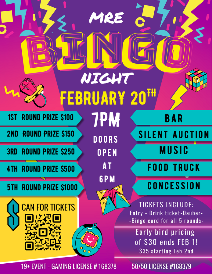 PAC BINGO NIGHT – Get your tickets for our ’90s-themed Bingo night on Feb 20th! Prizes up to $1000! Your ticket includes a free drink, dauber, and bingo cards for all 5 rounds. Music by DJ Pinky (Pinky’s Karaoke) and food from Tin Lizzy food truck! Click here to buy: https://mre-pac.square.site/