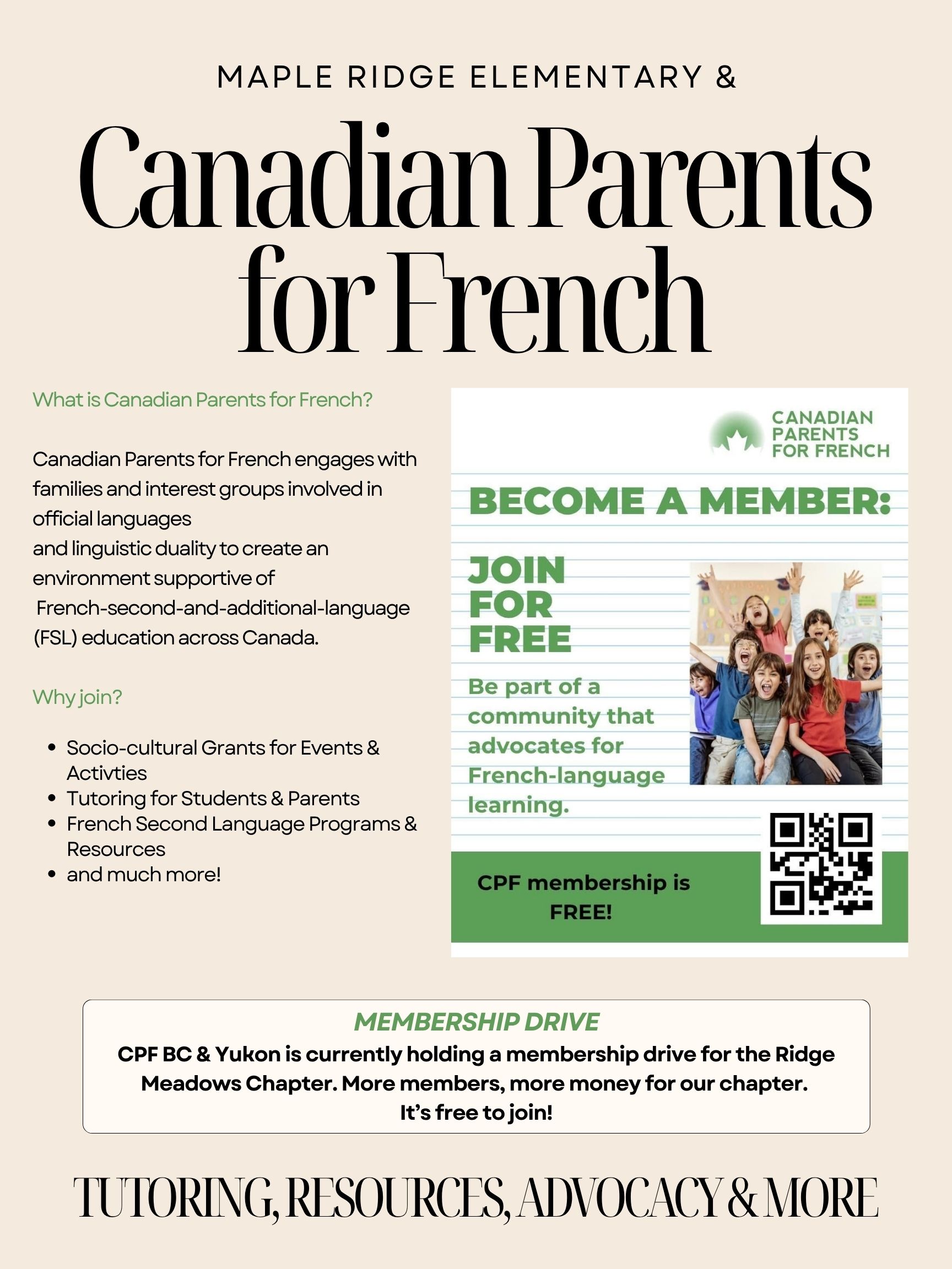 CANADIAN PARENTS FOR FRENCH – CPF BC & Yukon is holding a membership drive for the Ridge Meadows Chapter! It’s FREE to join and provides access to socio-cultural grants, tutoring for students & parents, French second language programs & resources, and more. See poster for details!