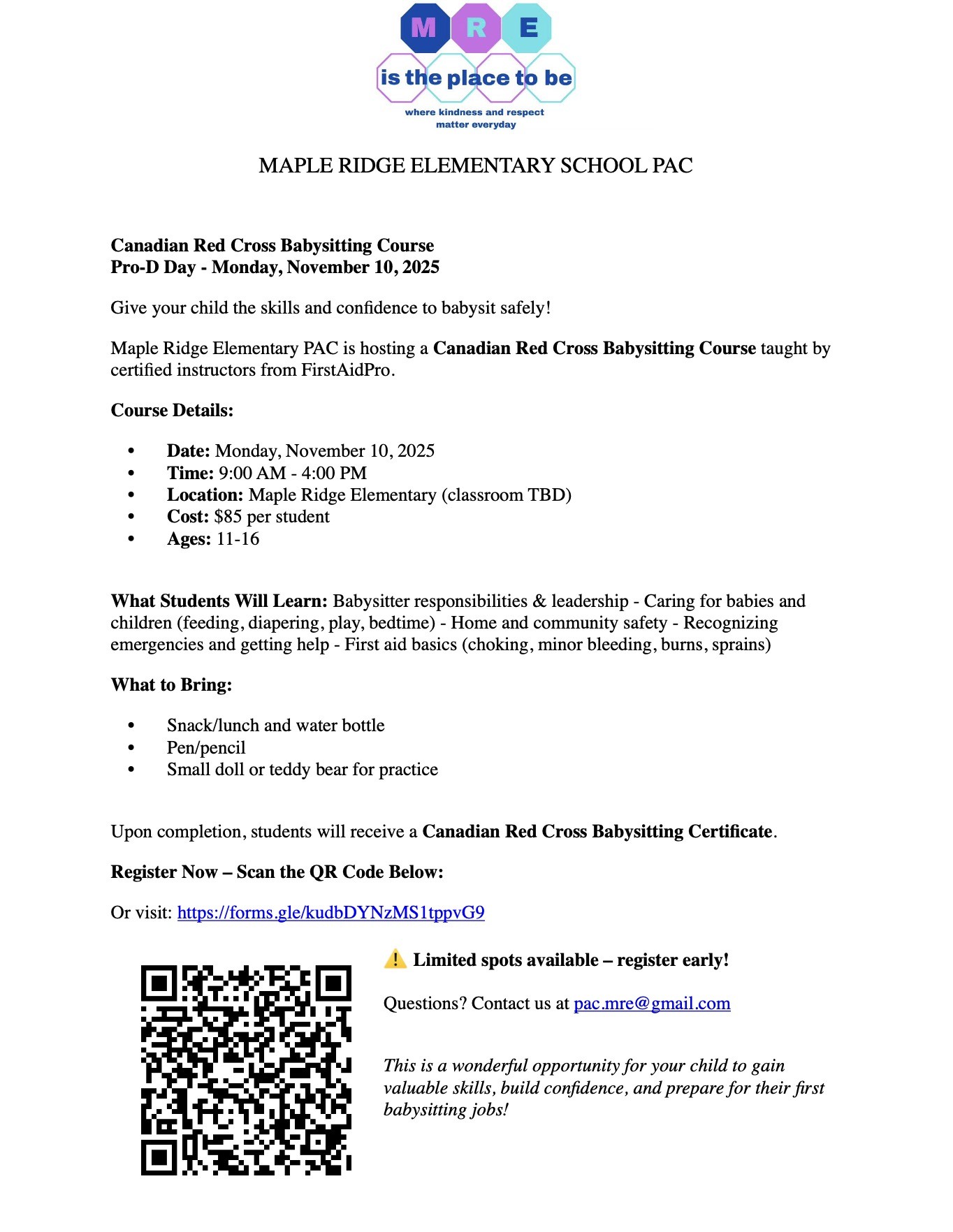 MRE PAC is hosting a Canadian Red Cross Babysitting Course on Pro-D Day, Monday, November 10, 2025 (9:00 AM – 4:00 PM) at Maple Ridge Elementary.